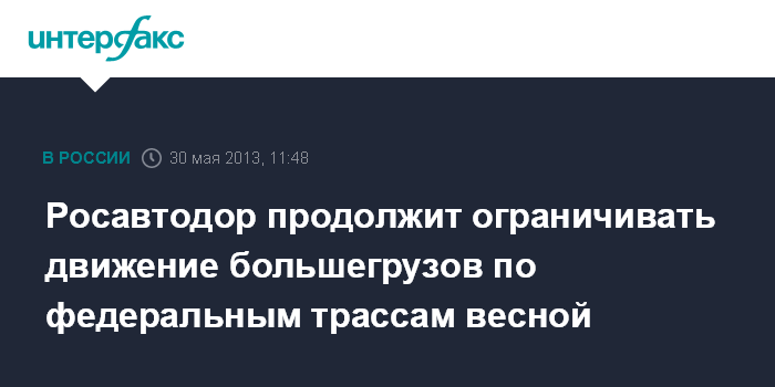 Иркутск. 30 мая. INTERFAX.RU - Федеральное дорожное агентство (Росавтодор) планирует продолжать практику ввода ограничений на движение большегрузного транспорта по федеральным автомобильным трассам в весенний период, сообщил заместитель руководителя Росавтодора Анатолий Безверхов на пресс-конференции в Иркутске в четверг.