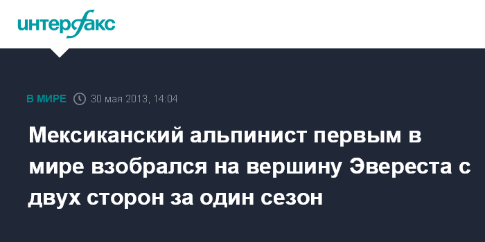 По информации AP, 33-летний мексиканский альпинист 11 мая взобрался на вершину горы, начав восхождение с южного склона в Непале. Спустя восемь дней он еще раз покорил вершину, но уже с северного склона.