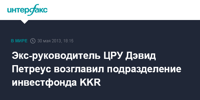 Нью-Йорк. 30 мая. INTERFAX.RU - Американский фонд прямых инвестиций KKR & Co. сообщил о приеме на работу бывшего руководителя Центрального разведывательного управления (ЦРУ) США Дэвида Петреуса, говорится в заявлении компании.