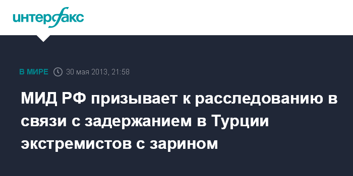 Москва. 30 мая. INTERFAX.RU - Официальный представитель МИД РФ Александр Лукашевич выразил крайнюю обеспокоенность в связи с сообщениями об аресте в Турции свыше десяти экстремистов террористической группировки "Фронт Ан-Нусра" с газом зарин.