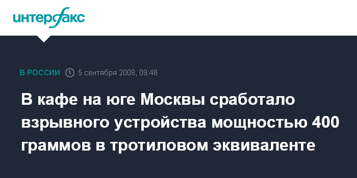 В кафе на юге Москвы сработало взрывного устройства мощностью 400 граммов в тротиловом эквиваленте