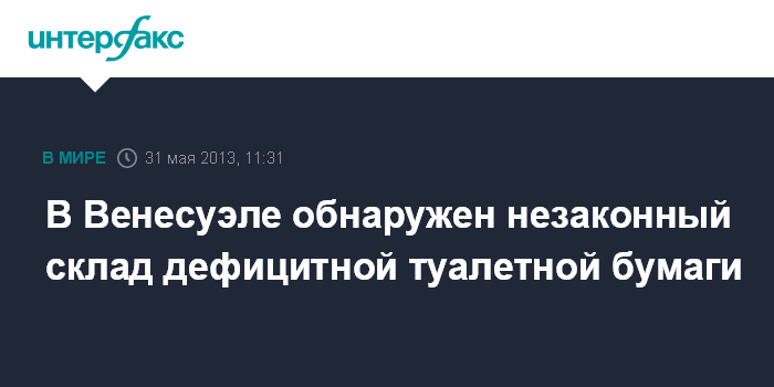 Каракас. 31 мая. INTERFAX.RU - Сотрудники венесуэльской полиции обнаружили в одном из пригородов Каракаса тайник с 2450 рулонами туалетной бумаги, заявили в пятницу в местном МВД. "Туалетная бумага находилась на потайном складе в пригороде Каракаса Антимано на западе венесуэльской столицы", - сообщил на своей странице в социальной сети Twitter глава этого ведомства Мигель Родригес Торрес