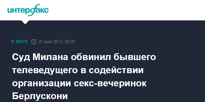 Рим. 31 мая. INTERFAX.RU - Суд Милана обвинил бывшего телеведущего Эмилио Феде и представителя шоубизнеса Леле Мора в том, что они были сообщниками бывшего премьера Италии Сильвио Берлускони в найме несовершеннолетней танцовщицы Руби для участия в секс-вечеринке на вилле премьера, сообщают в пятницу итальянские СМИ.