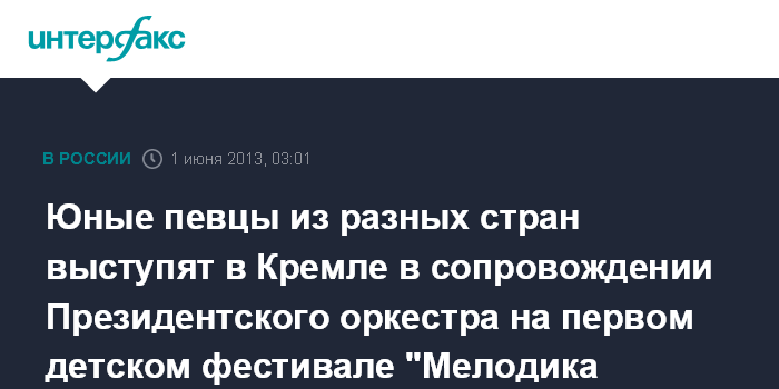 Москва. 1 июня. ИНТЕРФАКС - Первый Международный музыкальный детский фестиваль "Мелодика поколений" пройдет 1 июня, в День защиты детей, в Кремле.
