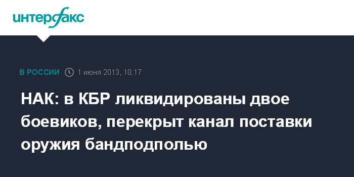 Москва. 1 июня. INTERFAX.RU - В КБР в ходе операции по пресечению поставок оружия боевикам уничтожены двое бандитов, сообщает информационный центр Национального антитеррористического комитета (НАК). По данным НАК, в ночь на субботу в Черекском районе проводились мероприятия по пресечению противоправной деятельности членов и пособников бандпополья, действующего на территории республики. Оперативниками ФСБ была получена информация о поставках оружия членам бандподполья, скрывающимся в горно-лесистой местности.