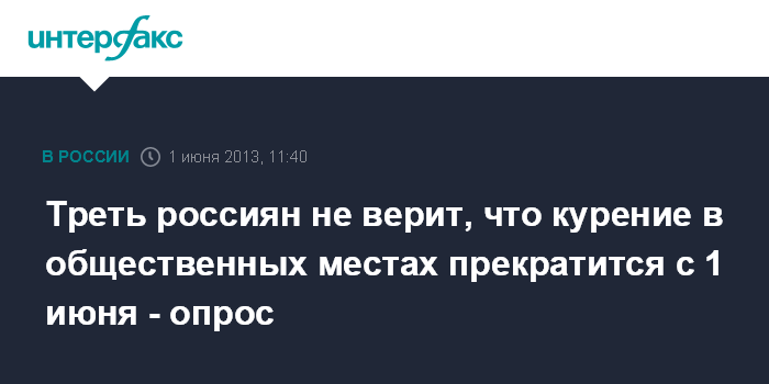 Москва. 1 июня. INTERFAX.RU - Большинство россиян знает о том, что с 1 июня в стране вводятся ограничения на курение в общественных местах: 46% хорошо известно об этом, еще 48% что-то слышали, но не знают деталей. Таковы данные опроса "Левада-Центра", проведенного 23-27 мая среди 1600 респондентов.