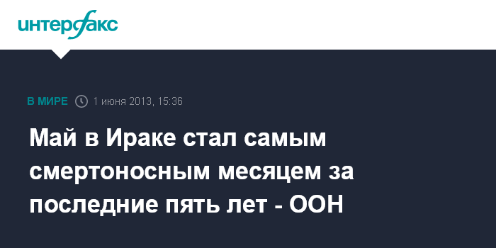 Нью-Йорк (ООН). 1 июня. INTERFAX.RU - Май признан самым кровавым месяцем в Ираке с июня 2008 года, говорится в докладе миссии ООН в Ираке.