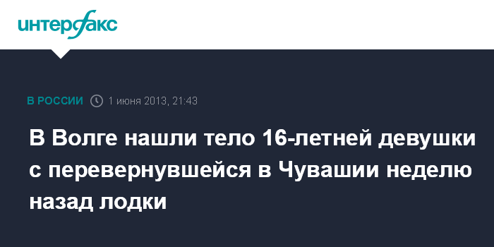 "Тело 16-летней девушки, утонувшей в Волге недалеко от города Мариинский Посад, где неделю назад перевернулась лодка с шестью пассажирами, обнаружили сегодня около пяти вечера у деревни Карабаши Мариинско-Посадского района местные жители, это на 20-30 км вниз по Волге. Его прибило к деревьям в нескольких метрах от берега", - отметил О. Дмитриев.