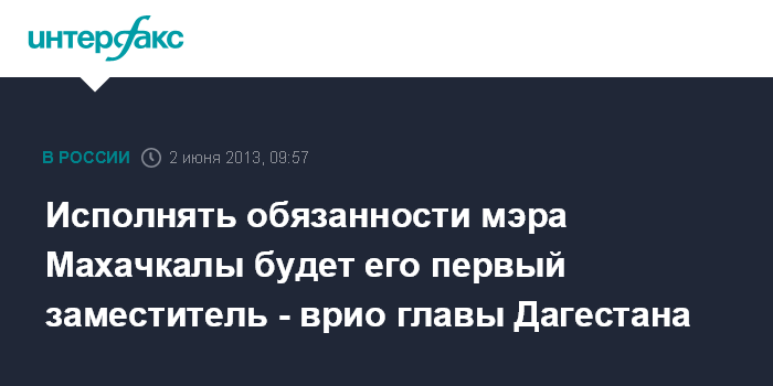 Махачкала. 2 июня. INTERFAX.RU - Обязанности мэра Махачкалы будет временно исполнять первый заместитель главы муниципального образования, сообщил врио главы Дагестана Рамазан Абдулатипов агентству "Интерфакс-Юг" в воскресенье.