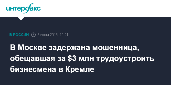 В Москве задержана мошенница, обещавшая за $3 млн трудоустроить бизнесмена в Кремле