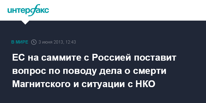 Москва/Брюссель. 3 июня. INTERFAX.RU - Евросоюз на саммите с Россией в Екатеринбурге поставит вопрос в связи с закрытием "дела Магнитского" за неимением виновных в его смерти и поднимет тему реализации закона о некоммерческих организациях.