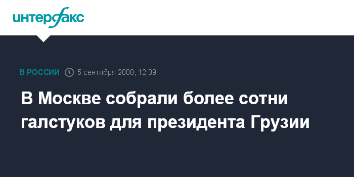 Москва. 5 сентября. INTERFAX.RU - Акция по сбору подержанных галстуков для президента Грузии Михаила Саакашвили, проводившаяся по инициативе молодежной палаты муниципального образования Гагаринское, завершилась в 4 сентября.
