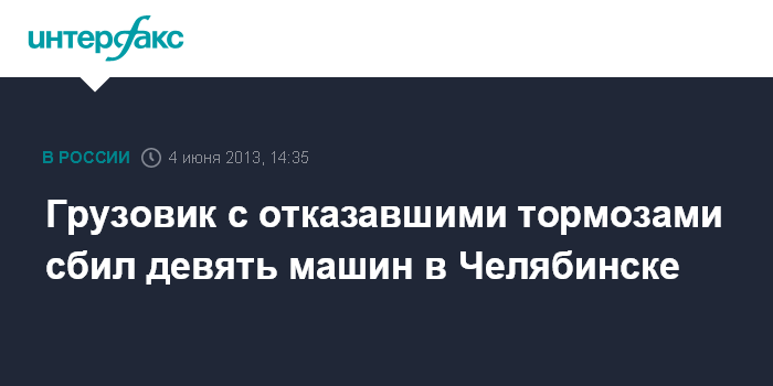 Челябинск. 4 июня. INTERFAX.RU - Грузовик со сломанными тормозами сбил девять машин на оживленном проспекте в Челябинске утром во вторник, сообщил агентству "Интерфакс" сотрудник пресс-службы ГИБДД города Виталий Мордовин.
