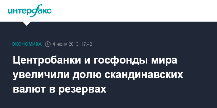 Нью-Йорк. 4 июня. INTERFAX.RU - Центральные банки и фонды национального благосостояния по всему миру стали активнее добавлять к своим резервам скандинавские валюты в попытке отхода от евро и доллара, но сохраняя вложения в наиболее надежные валюты мира.