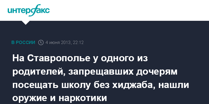 Пятигорск. 4 июня. INTERFAX.RU - В Советском районе Ставрополья в доме Магомеда Газимагомедова, который в числе других жаловался на то, что его дочери запрещают посещать школу в хиджабе, силовики обнаружили оружие и наркотики, сообщает во вторник пресс-служба краевого УФСБ.