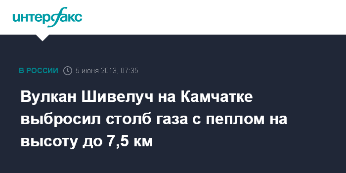 Петропавловск-Камчатский. 5 июня. ИНТЕРФАКС - ДАЛЬНИЙ ВОСТОК - Вулкан Шивелуч, извергающийся на Камчатке, выбросил несколько столбов газа с примесью пепла, высота набольшего из которых составила до 7,5 км над уровнем моря, сообщил агентству "Интерфакс - Дальний Восток" в среду представитель Камчатского филиала Геофизической службы РАН.