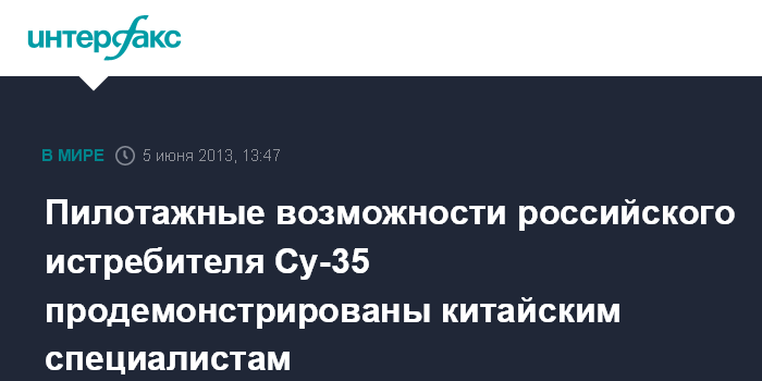 Москва. 5 июня. INTERFAX.RU - Китайские специалисты высоко оценили пилотажные возможности нового российского многофункционального истребителя Су-35, демонстрационный показ которого прошел в среду в подмосковной Кубинке, сообщил "Интерфаксу" источник в структурах, связанных с экспортом вооружений.