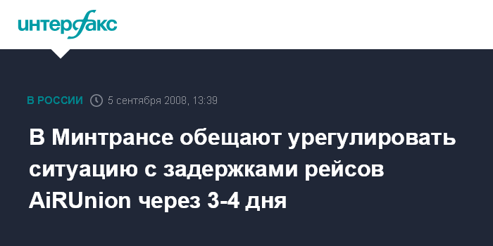 Москва. 5 сентября. INTERFAX.RU - Ситуация с задержками рейсов авиаальянса AiRUnion войдет в норму через 3-4 дня, заявил заместитель министра транспорта, председатель совета директоров основной компании альянса "Красноярские авиалинии" Александр Мишарин.