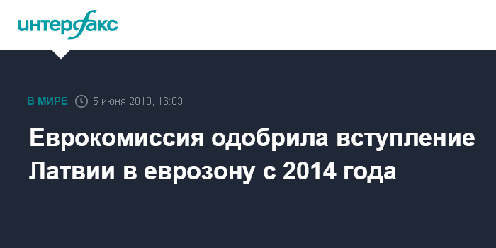 Брюссель. 5 июня. INTERFAX.RU - Европейская комиссия (ЕК) одобрила вступление Латвии в еврозону с 1 января 2014 года, говорится в докладе ЕК.