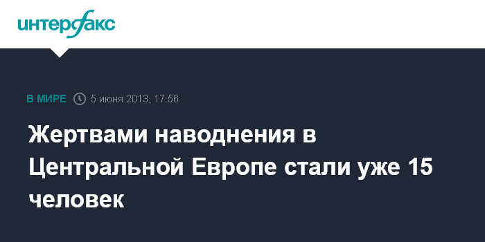 Прага. 5 июня. INTERFAX.RU - По последним данным, число погибших в результате наводнения в Центральной Европе достигло 15 человек, сообщили в среду западные СМИ. "Восемь из 15 человек погибли на территории Чехии, четверо в Германии, два в Австрии и еще один в Словакии", - говорится в сообщении.