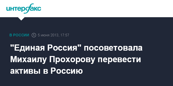 Москва. 5 июня. INTERFAX.RU - В руководстве "Единой России" советуют лидеру "Гражданской платформы" Михаилу Прохорову перевести свои зарубежные активы в Россию, если он действительно хочет участвовать в выборах мэра Москвы.