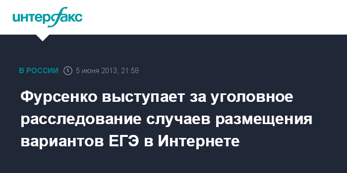 "Размещение в интернете вариантов ЕГЭ является уголовным преступлением, и это дело для правоохранительных органов. Я надеюсь, что дела, связанные с размещением вариантов ЕГЭ, будут доведены до логического конца - до суда", - сказал Фурсенко "Интерфаксу" в среду.