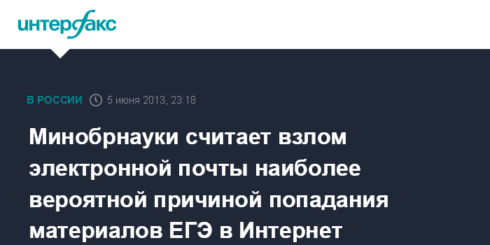 Москва. 5 июня. INTERFAX.RU - Взлом электронной почты, по которой задания к ЕГЭ рассылаются в труднодоступные населенные пункты, - наиболее вероятная причина попадания в Интернет подлинных экзаменационных материалов, сообщил замминистра Минобрнауки Игорь Реморенко.