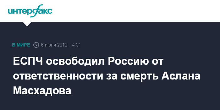 Страсбург. 6 июня. INTERFAX.RU - Россия не ответственна за смерть лидера чеченских сепаратистов Аслана Масхадова, говорится в оглашенном в четверг постановлении Европейского суда по правам человека (ЕСПЧ).
