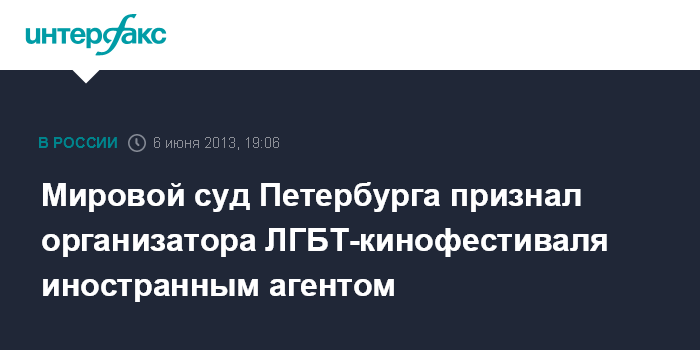 Санкт-Петербург. 6 июня. INTERFAX.RU - Судья мирового судебного участка №206 Петербурга признал автономную некоммерческую организацию "ЛГБТ-кинофестиваль "Бок о бок", являющуюся организатором одноименного кинофестиваля, иностранным агентом, передал корреспондент "Интерфакса".