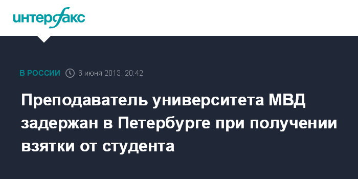 "Преподаватель был задержан сегодня сотрудниками ГУ МВД по северо-западу и ОВД по Василеостровскому району при получении взятки в 20 тыс. рублей от студента", - сказал собеседник агентства.