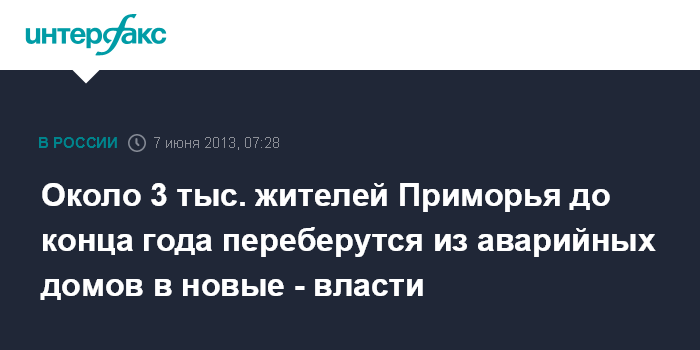 Владивосток. 7 июня. ИНТЕРФАКС-ДАЛЬНИЙ ВОСТОК - В рамках подпрограммы о переселении граждан из аварийного жилья в Приморье на 2013-2017 годы в этом году будут расселены жители 208 непригодных домов, сообщает пресс-служба администрации края.