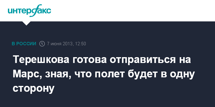 "Но мы знаем человеческий предел. И для нас это остается мечтой. Скорее всего первый полет будет полет в одну сторону", - сказала Терешкова. "Но я готова", - отметила она.