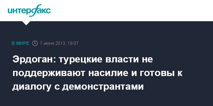 Стамбул. 7 июня. INTERFAX.RU - Правительство Турции выступает против насилия и открыто для диалога с манифестантами, сообщил в пятницу журналистам премьер-министр страны Реджеп Тайип Эрдоган.