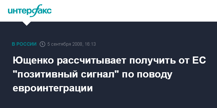 Киев. 5 сентября. INTERFAX.RU - Украина надеется, что на саммите Украина-ЕС во Франции ей будет дан позитивный сигнал по поводу ее евроинтеграционных устремлений, заявил президент Виктор Ющенко.
