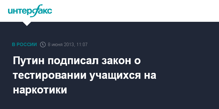 Москва. 8 июня. INTERFAX.RU - Президент РФ Владимир Путин подписал закон, которым вводится тестирование учащихся на употребление наркотиков и психотропных веществ. Как говорится в сообщении на сайте Кремля, федеральный закон "О внесении изменений в отдельные законодательные акты РФ по вопросам профилактики незаконного (немедицинского) потребления наркотических средств и психотропных веществ" принят Госдумой 15 мая и одобрен Советом Федерации 29 мая.