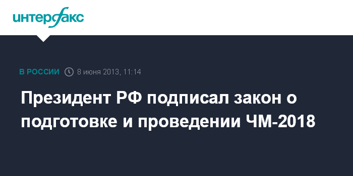 Москва. 8 июня. INTERFAX.RU - Президент РФ Владимир Путин подписал федеральный закон "О подготовке и проведении в Российской Федерации чемпионата мира по футболу FIFA 2018 года, Кубка конфедераций FIFA 2017 года и внесении изменений в отдельные законодательные акты Российской Федерации", говорится в сообщении, размещенном в субботу на сайте Кремля.