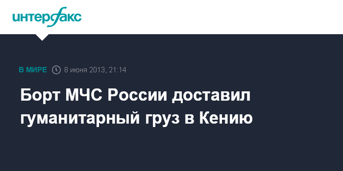 Москва. 8 июня. ИНТЕРФАКС - Самолет МЧС России доставил в Кению гуманитарную помощь, сообщила журналистам официальный представитель министерства Ирина Россиус.