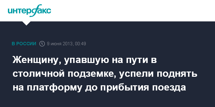 Москва. 9 июня. ИНТЕРФАКС - Женщина упала на пути на станции метро "Беговая" в Москве поздно вечером в субботу, сообщили "Интерфаксу" в пресс-службе столичного ГУ МВД России.