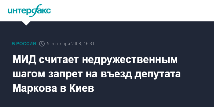 Москва. 5 сентября. INTERFAX.RU - В Москве озабочены решением украинских властей не пускать на территорию Украины депутата Госдумы РФ Сергея Маркова и называют этот шаг недружественным.