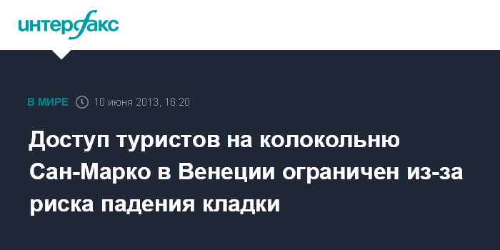 Рим. 10 июня. INTERFAX.RU - Власти Венеции из соображений безопасности ограничили доступ к колокольне Сан-Марко, сообщает в понедельник туринская газета La Stampa. "Колокольня была огорожена с двух сторон из соображений безопасности в связи с угрозой падения фрагментов конструкции", - пишет издание.