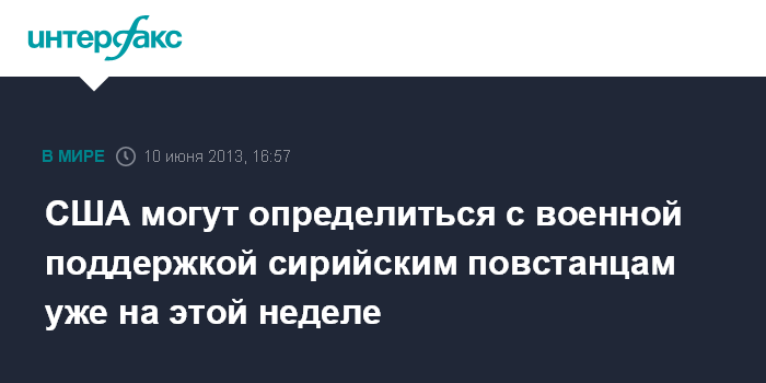 Вашингтон. 10 июня. INTERFAX.RU - Американские власти, возможно, примут решение по возможным поставкам оружия сирийским повстанцам уже на этой неделе, сообщил в понедельник неназванный чиновник из администрации президента США.
