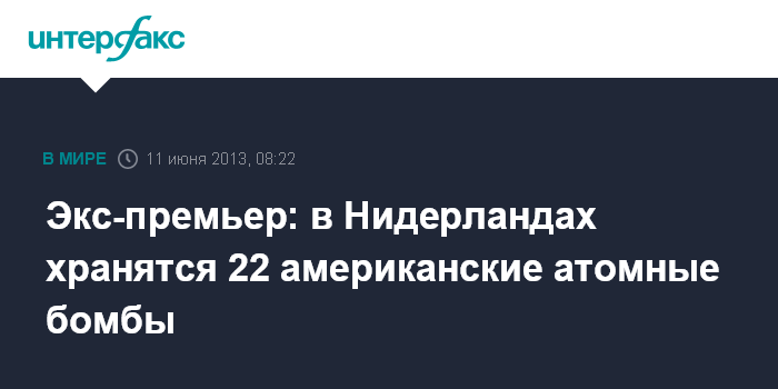 На территории Нидерландов находятся 22 американские ядерные авиабомбы Б-61 мощностью 50 килотонн, утверждает экс-премьер страны. Возглавлявший в 1982-94 гг. нидерландское правительство Любберс заявил, что атомное оружие размещено в подземных хранилищах авиабазы ВВС США Волкел в провинции Северный Брабант.