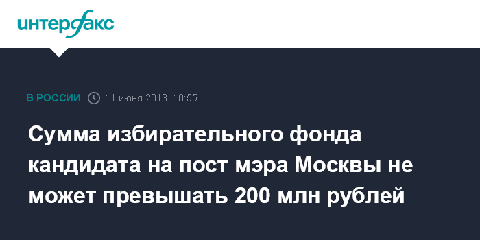 Москва. 11 июня. INTERFAX.RU - Предельная сумма всех расходов и средств избирательного фонда кандидата на должность мэра Москвы не может превышать 200 млн рублей, сообщили "Интерфаксу" в пресс-центре Мосгоризбиркома во вторник.