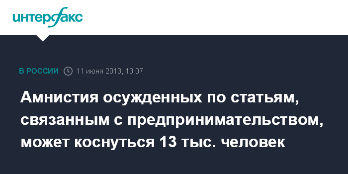 Москва. 11 июня. INTERFAX.RU - Под "предпринимательскую" амнистию могут попасть около 13 тыс. человек, заявил в ходе обсуждения в Общественной палате представитель уполномоченного по защите бизнеса от уголовного преследования Андрей Назаров.