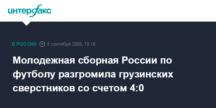 Минск. 5 сентября. ИНТЕРФАКС - Отборочный матч молодежного чемпионата Европы-2009 между сборными России и Грузии на минском стадионе "Трактор" закончился победой россиян с разгромным счетом - 4:0.