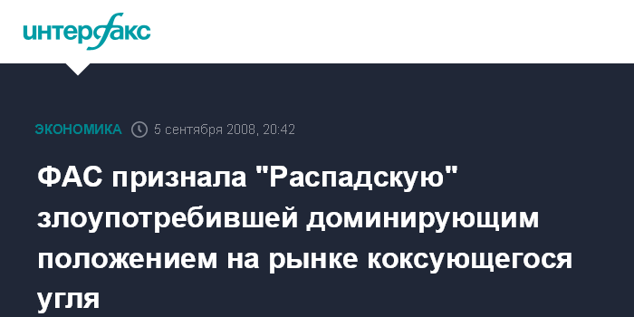 Москва. 5 сентября. ИНТЕРФАКС - Федеральная антимонопольная служба (ФАС) РФ в пятницу признала ООО "Распадский уголь" (входит в группу ОАО "Распадская") нарушившим закон о защите конкуренции в части злоупотребления компаниями доминирующим положением на рынке коксующегося угля, говорится в сообщении ФАС.