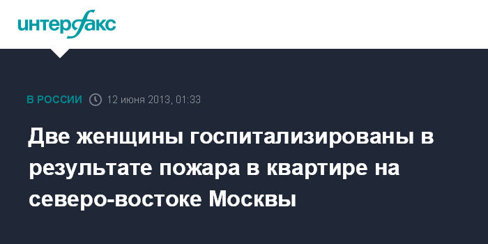 Москва. 12 июня. ИНТЕРФАКС - Два человека госпитализированы после пожара на северо-востоке столицы, сообщил "Интерфаксу" источник в правоохранительных органах.