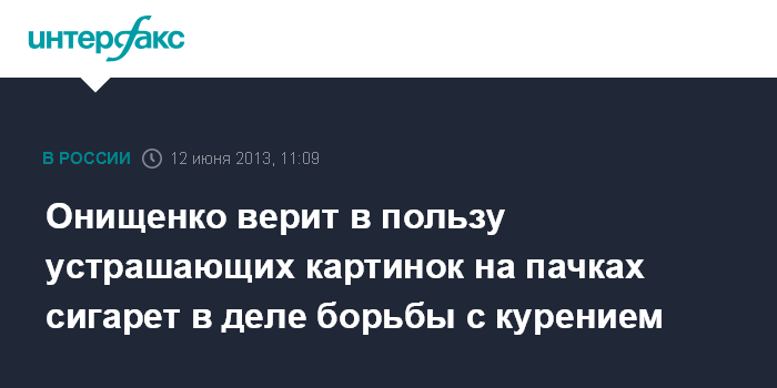 Москва. 12 июня. INTERFAX.RU - Руководитель Роспотребнадзора, главный государственный санитарный врач РФ Геннадий Онищенко заявил, что появление на пачках сигарет устрашающих картинок будет иметь ощутимый профилактический эффект в рамках компании по борьбе с курением в России.