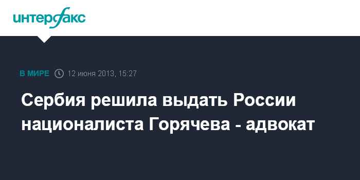Москва. 12 июня. INTERFAX.RU - Сербский суд принял решение экстрадировать в Россию националиста Илью Горячева, обвиняемого в ряде тяжких преступлений в рамках дела против активистов организации "БОРН".