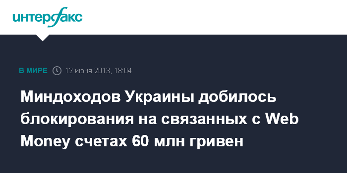Киев. 12 июня. INTERFAX.RU - Министерство доходов и сборов Украины добилось блокирования на связанных с компанией электронных платежей Web Money счетах 60 млн гривен, сообщили агентству "Интерфакс-Украина" в центральном офисе по работе с крупными налогоплательщиками министерства в среду.